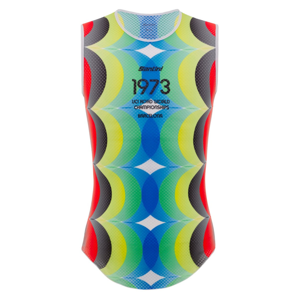 Sleeveless baselayer made with a micro mesh elasticated fabric that guarantees absolute comfort and maximum breathability even on the hottest days. Featuring an elongated cut that offers maximum protection fitting perfecly underneath your jersey. Design inspired by the Official 1973 Barcelona UCI World Championships poster.