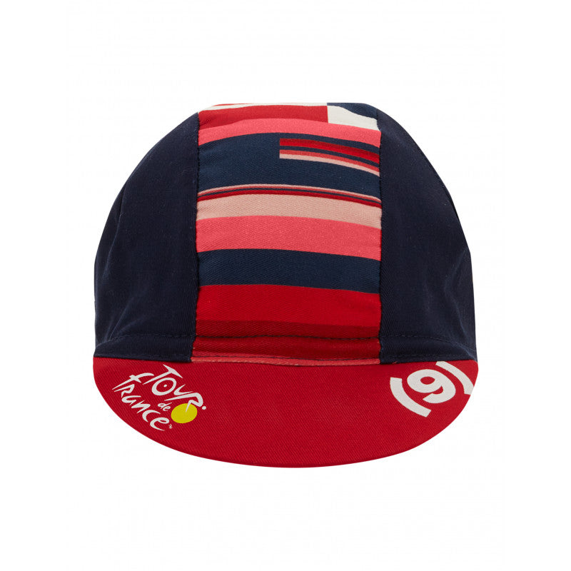 Cotton cycling cap. Perfect on the hottest summer days to shield you from the sun. With a special design dedicated to stage 9 from Aigle to Châtel Les Portes du Soleil plays with a subtle ‘multi-line’ motif, creating a dynamic and bold visual image. The shades of red and white used pay reference to the fact that the stage passes through beautiful Switzerland.