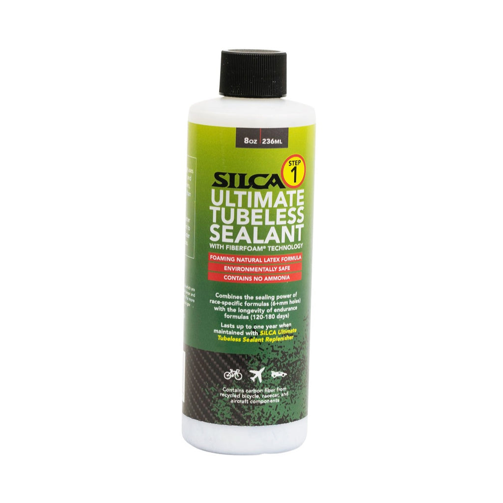 SILCA Ultimate Tubeless Sealant uses the power of a foaming latex formula combined with chopped carbon fibres to boost sealing power even at higher pressures. Ultimate Tubeless Sealant contains 5% by volume, 6, 9, and 12mm chopped carbon fibers which have been reclaimed from recycled bicycles, carbon wheels, racecars, and aircraft components. A unique foaming latex formula allows for the very lightweight carbon fibres to be evenly dispersed within the sealant while riding, which allows for a higher fibre content than possible with Kevlar or fibreglass. At this high fibre loading, bundles of carbon fibre are carried directly to the puncture by the sealant flow where thousands of micro-bubbles collapse on each other, depositing their high stiffness carbon fibers over the hole. During this process, the carbon fibres form a dam of fibres against the tire casing not unlike a beaver dam of sticks blocking the flow of a stream. This dam of high stiffness/high strength fibres has been shown to seal holes in testing up to 7.5mm, some 25% larger than conventional technologies.