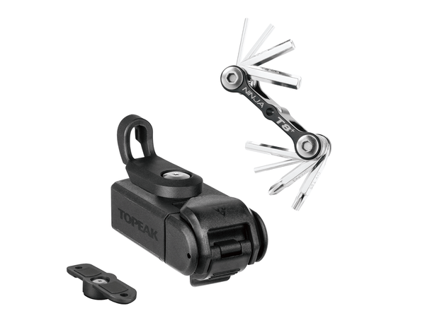 Mounts under ninja water bottle cage with interchangeable cage mount or use alone with a frame mount. This weatherproof toolbox contains an 8 function mini-tool for basic repair and maintenance. Tools:...