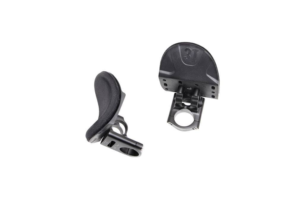 Clip-On without Extensions is a combination kit to build up suitable 31.8‑mm diameter bars with aero extensions. The kit comprises clamps, new comfort cradles and silicone pads, and all fixing hardware. Choose extensions from the 3T Extensions range comprising S-Bend, Straight, Ski-Bend, Short Ski-Bend, and Wrist Comfort Bend, in AL-alloy and carbon-fiber. Stack height can be adjusted in the range of 57–87 mm using the Riser Kit (separately available). Clip Ons must not be fitted to any Ltd road bar model except Aeronova Ltd and Aerotundo Ltd.