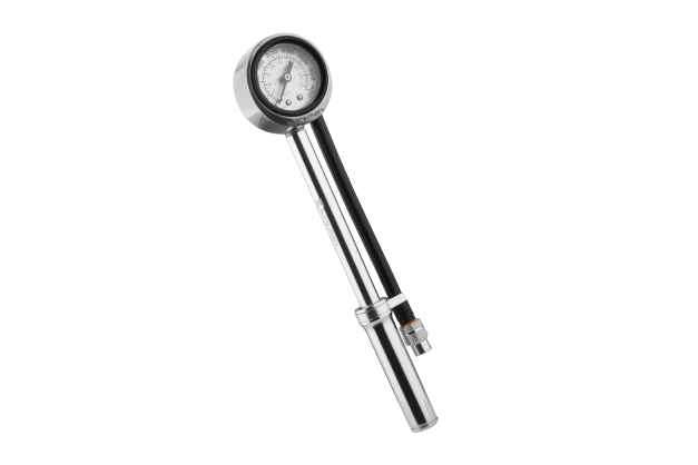 The Salut shock pump is equipped with a 1.6” gauge with a pressure release button, ensuring precise air pressure adjustments. The threaded valve adapter screws onto a Schrader valve on the shock in one easy step and follows the same process when disconnecting.