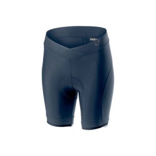 This is Castelli’s entry-level women’s short but it’s a shame to think of it that way. It could almost be a top-of-the-line short considering the components, fabrics, and engineering that have gone into it. The seat pad is the women’s-specific version of our Kiss Air2 pad. The Pro Dry two-layer fabric has 15% polyester on the inside to help actively move moisture to the nylon outer layer. The 19% elastane/spandex provides excellent stretch, which together with the six-panel construction gives this short a fantastic fit. We’ve concentrated on two critical places to improve comfort and applied our cross-wrap construction to the waist and leg endings for a softer and stretchier way to achieve a comfortable fit. On the leg endings, we’ve added reflective tape around the back for increased visibility. Maybe you should just think of it as a great deal on a top-level short.