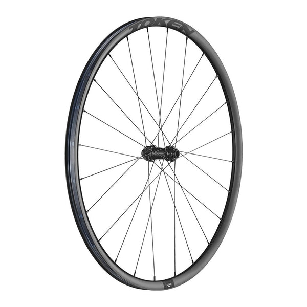 Stiff-tuned rear wheel supports peak loads and enhances stability and tracking at speed. Narrower inner rim width helps a thinner tire profile in the rear, improves rolling resistance, and sharpens the tire edge for grip.