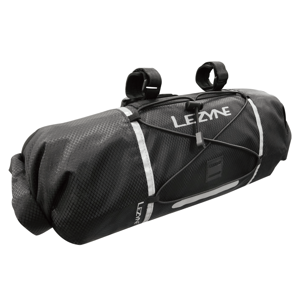 Medium capacity handlebar bag designed for ease of use and maximum functionality. Easy access, double-sided roll-type enclosures. Highly water-resistant, compressible design. High-quality, durable materials. Adjustable straps and a simple Velcro mounting system. External draw cords hold extra gear. Reflective features and light mounts add additional safety.