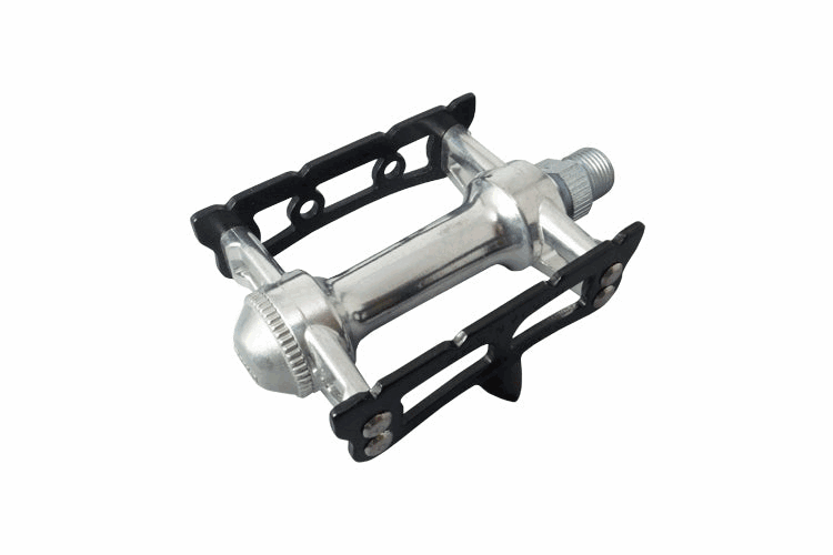 The MKS Sylvan Track features a short two-piece single-sided cage built around a compact pedal body that allows for ample ground clearance when cornering. The Sylvan Track is designed to be used on the steep banking of a velodrome but is also at home on the road. The cage plate tooth profile is almost smooth, so we recommend toe clips and straps with this pedal.