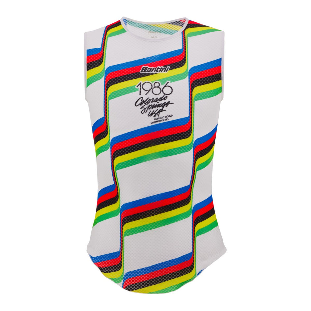 Sleeveless baselayer made with a micro-mesh elasticated fabric that guarantees absolute comfort and maximum breathability even on the hottest days. It features an elongated cut that offers maximum protection fitting perfectly underneath your jersey. Design inspired by the Official 1986 Colorado Springs UCI World Championships.