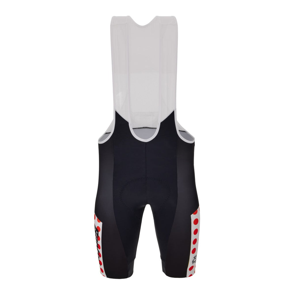 Tour de France King of the Mountain official bib-shorts. Made in compression effect fabric. Incredibly durable it retains its features through time. Foam Bio chamois. Mesh breathable braces for maximum breathability and comfort even in the hottest days. These bib-shorts always stay in position while riding thanks to the durable elasticated leg band with internal silicone gripper. A perfect match to your King of the Mountain Fan Line leader jersey.
