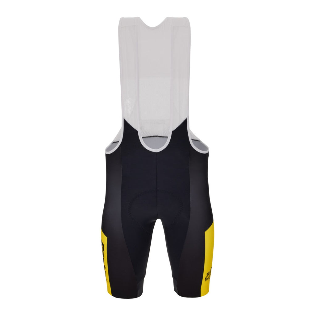 Tour de France Overall leader in official bib-shorts. Made in compression effect fabric. Incredibly durable it retains its features through time. Foam Bio chamois. Mesh breathable braces for maximum breathability and comfort even in the hottest days. These bib shorts always stay in position while riding thanks to the durable elasticated leg band with an internal silicone gripper. A perfect match to your Overall leader Fan Line leader jersey.