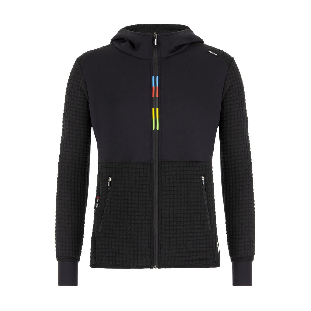 Official UCI Rainbow hooded fleece jacket made with revolutionary, ultra and incredibly warm Polartec PowerAir fabric. Minimal design with just the right amount of Rainbow stripes added for a classy look. The jacket features 2 zipped front pockets, a shaped hood and a full front zipper.