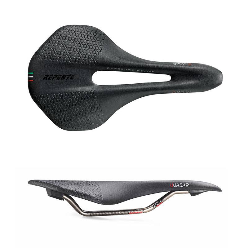 The shape of the Quasar saddle is characterized by the 142 mm seat of "flat" inspiration and by the central opening, inserted in a large channel for the discharge of perineal pressure. The large rear support surface has been modeled according to the anatomical and ergonomic criteria that represent a peculiar feature of all Repente saddles. The "close fit" effect produced by this particular shaping makes the seat comfortable without the use of thick layers of padding and allows you to immediately find the most effective position in the saddle.
