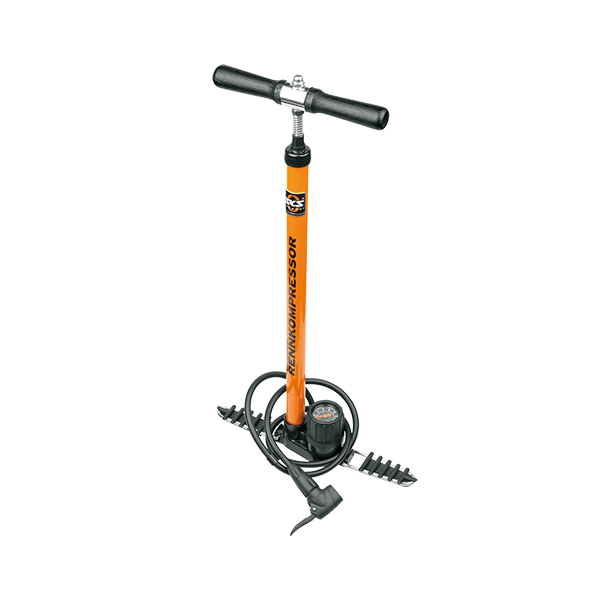The RENNKOMPRESSOR has been the most popular pump in international cycling for more than 50 years and the sole legitimate ancestor of all bike stand pumps. The solid metal tube, cast iron base, precision pressure gauge, and black wooden handle are proof of the best “made in Germany” quality. The feet fold up to make it easier to transport.