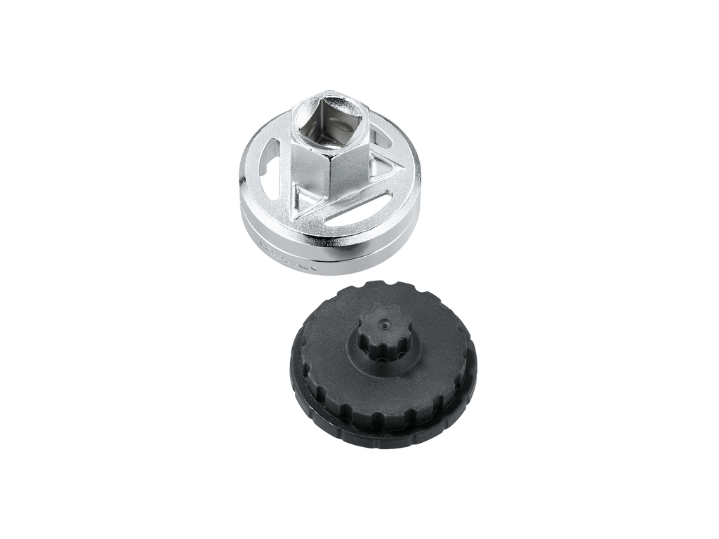 Engages the 16 notches of the external bearing cups. A small plastic tool engages the 8 internal splines of the crank arm adjustment cap and engages 16 notches of the external bearing cups for Shimano® BB 9000 for easy removal or installation. * Shimano® is a registered trademark of Shimano Inc.